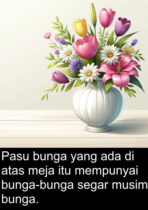 Pasu bunga yang ada di atas meja itu mempunyai bunga-bunga segar musim bunga.