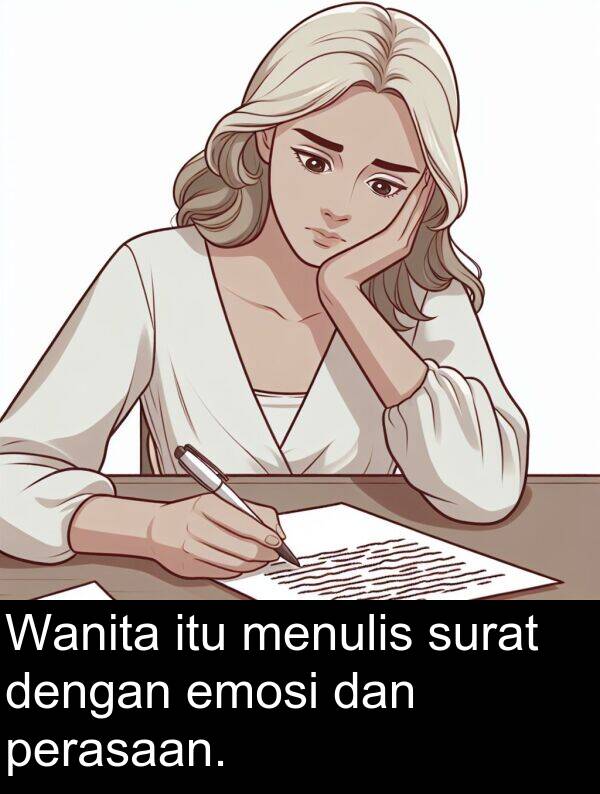 Wanita itu menulis surat dengan emosi dan perasaan.