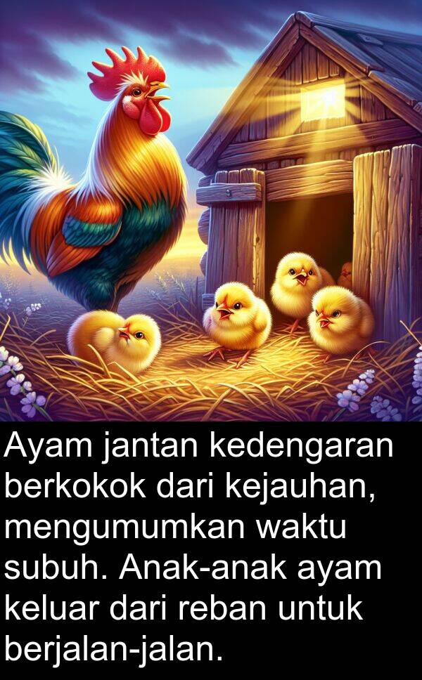 Ayam jantan kedengaran berkokok dari kejauhan, mengumumkan waktu subuh. Anak-anak ayam keluar dari reban untuk berjalan-jalan.