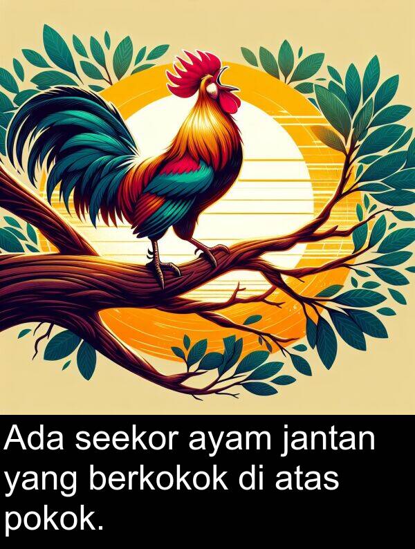Ada seekor ayam jantan yang berkokok di atas pokok.