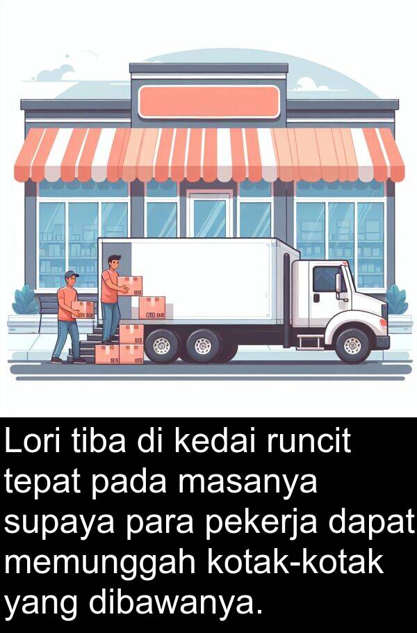 Lori tiba di kedai runcit tepat pada masanya supaya para pekerja dapat memunggah kotak-kotak yang dibawanya.