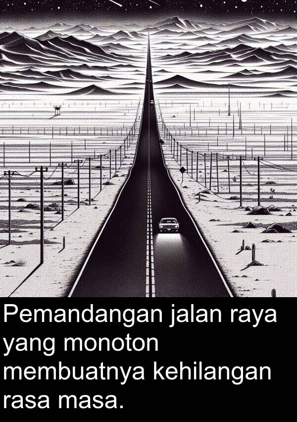 Pemandangan jalan raya yang monoton membuatnya kehilangan rasa masa.