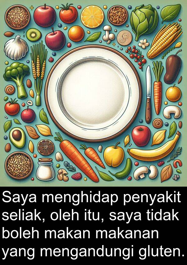 Saya menghidap penyakit seliak, oleh itu, saya tidak boleh makan makanan yang mengandungi gluten.