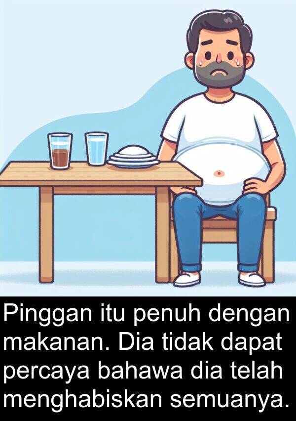 Pinggan itu penuh dengan makanan. Dia tidak dapat percaya bahawa dia telah menghabiskan semuanya.
