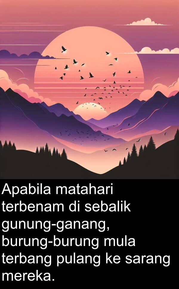 Apabila matahari terbenam di sebalik gunung-ganang, burung-burung mula terbang pulang ke sarang mereka.
