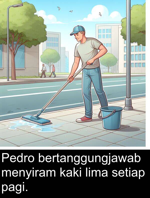 Pedro bertanggungjawab menyiram kaki lima setiap pagi.