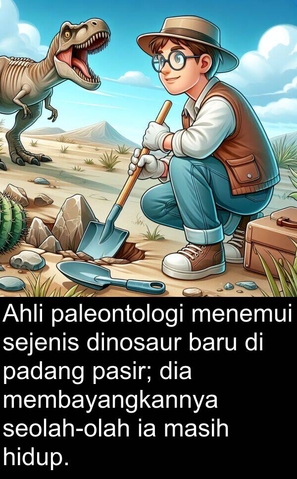 Ahli paleontologi menemui sejenis dinosaur baru di padang pasir; dia membayangkannya seolah-olah ia masih hidup.