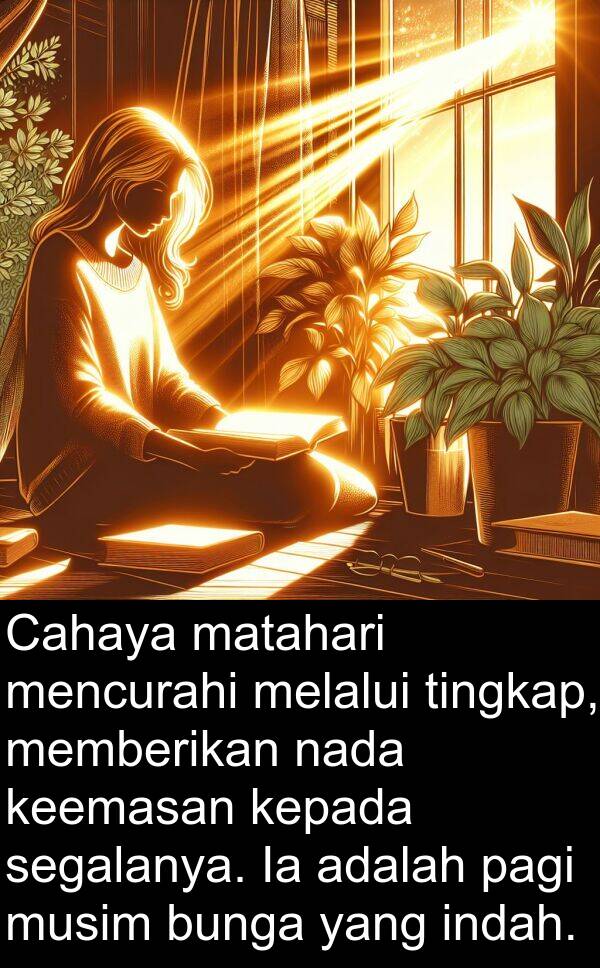 Cahaya matahari mencurahi melalui tingkap, memberikan nada keemasan kepada segalanya. Ia adalah pagi musim bunga yang indah.