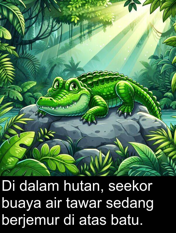 Di dalam hutan, seekor buaya air tawar sedang berjemur di atas batu.