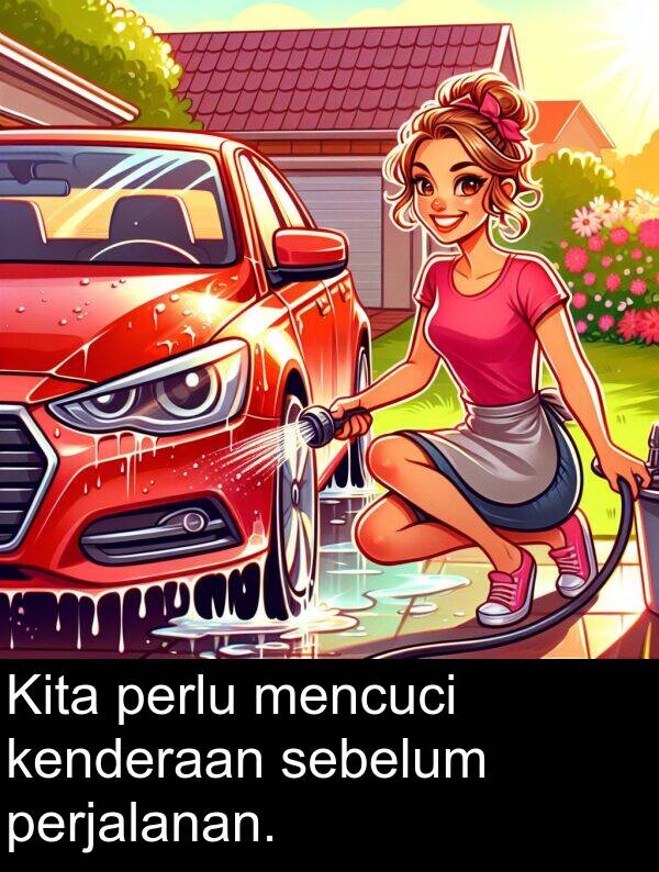 Kita perlu mencuci kenderaan sebelum perjalanan.