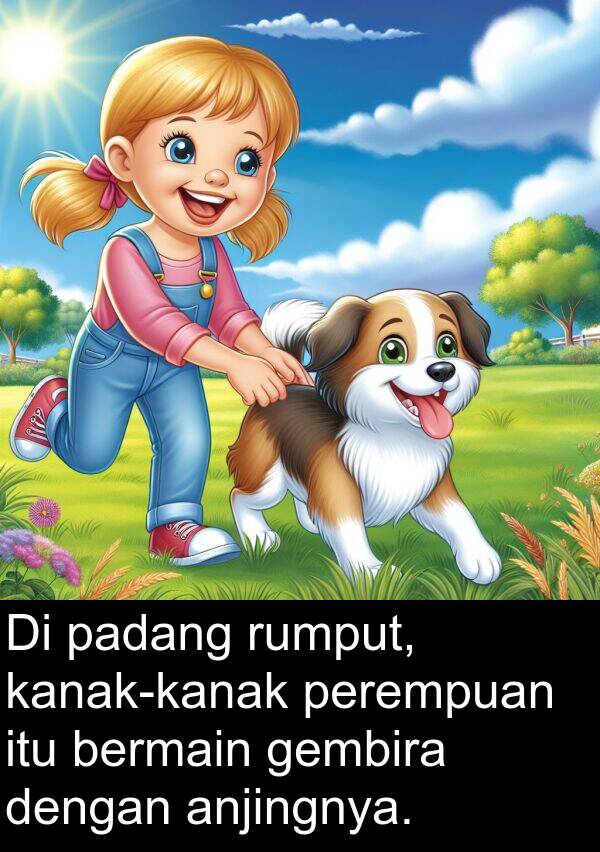 Di padang rumput, kanak-kanak perempuan itu bermain gembira dengan anjingnya.