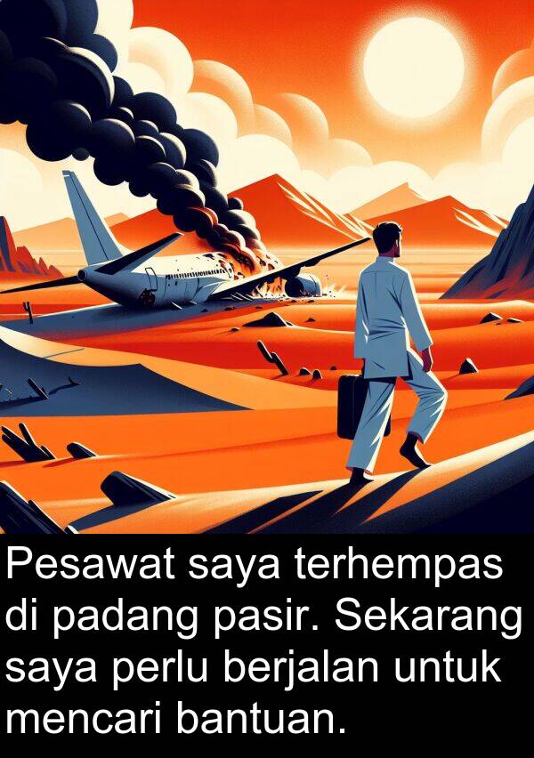 Pesawat saya terhempas di padang pasir. Sekarang saya perlu berjalan untuk mencari bantuan.